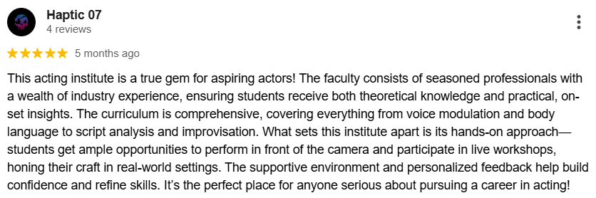 "Students reach their full acting potential—whether it’s developing strong stage presence, overcoming camera shyness, or breaking into the film industry."